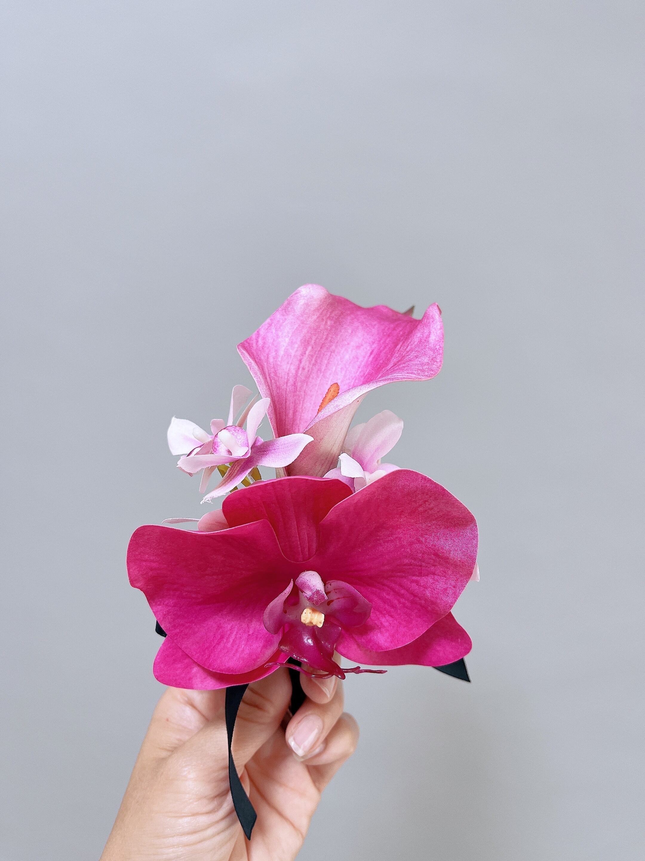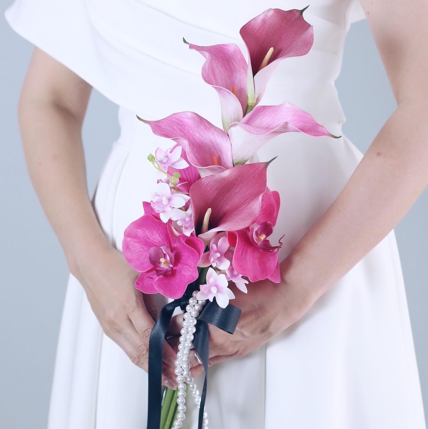 スラリとしたカラーのラインに、鮮やかなマゼンダの胡蝶蘭を合わせたスタイリッシュなアームブーケです。