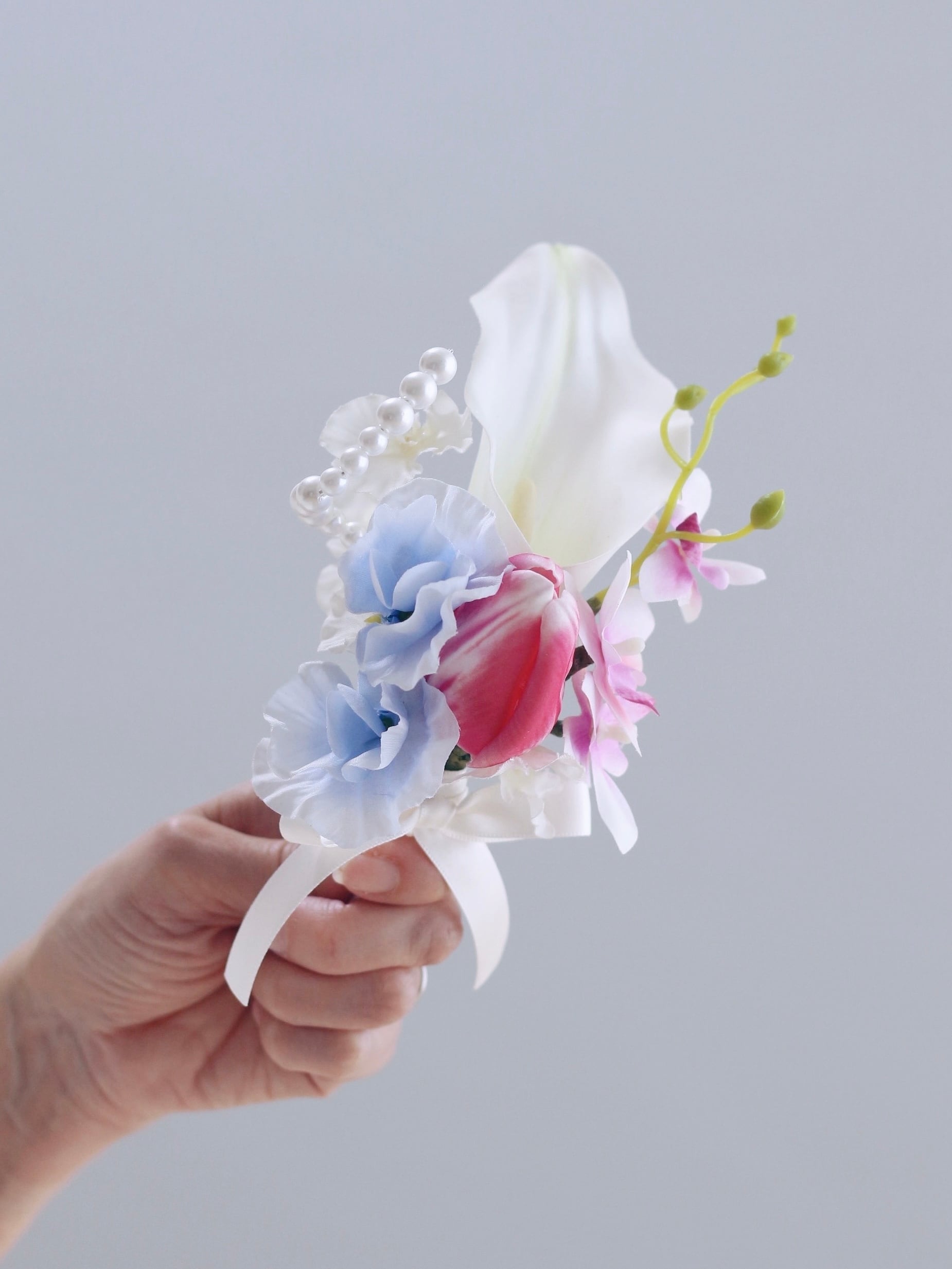 優しいピンクを基調に、カラー・胡蝶蘭・チューリップ・パールを組み合わせ、甘くなりすぎない洗練された印象に仕上げました。