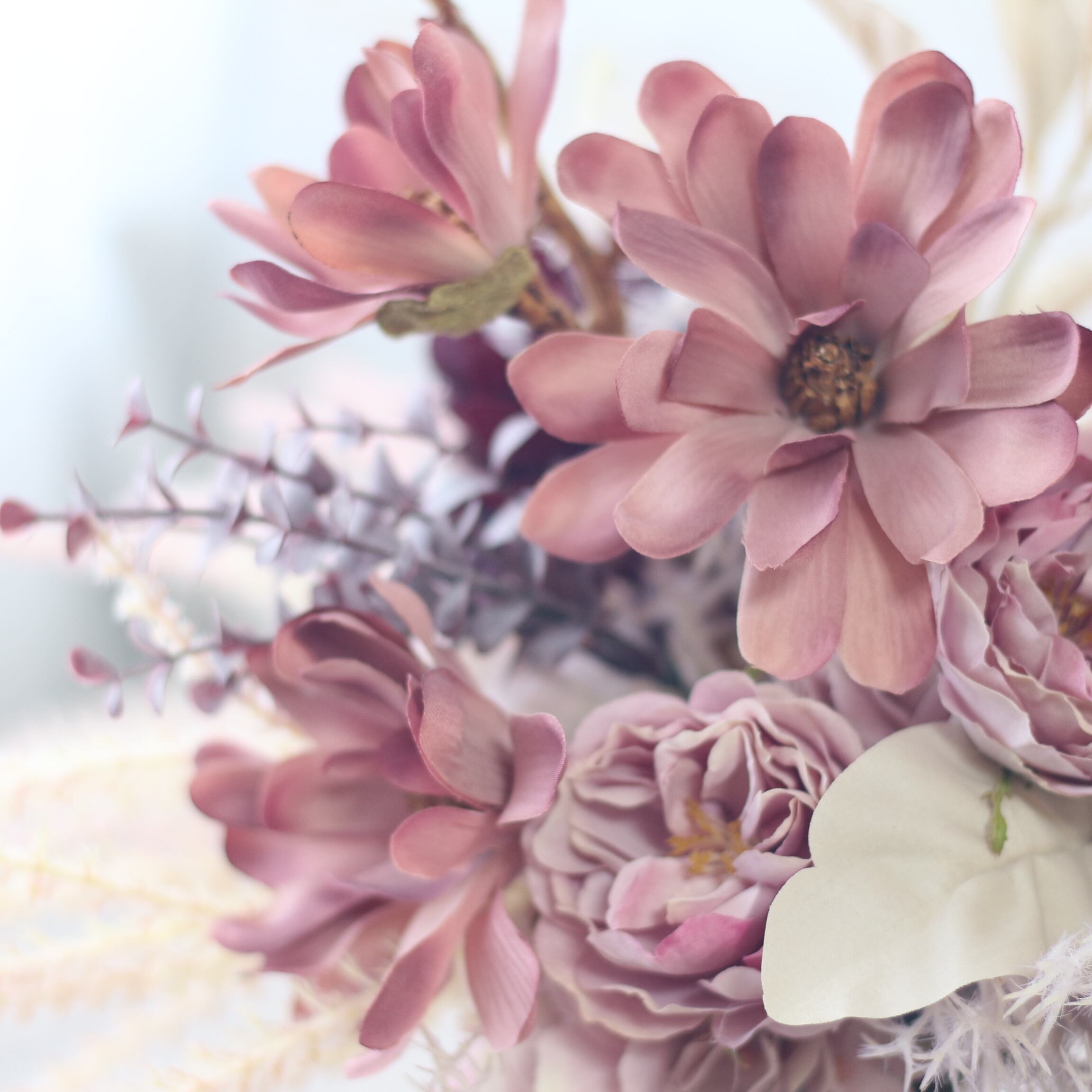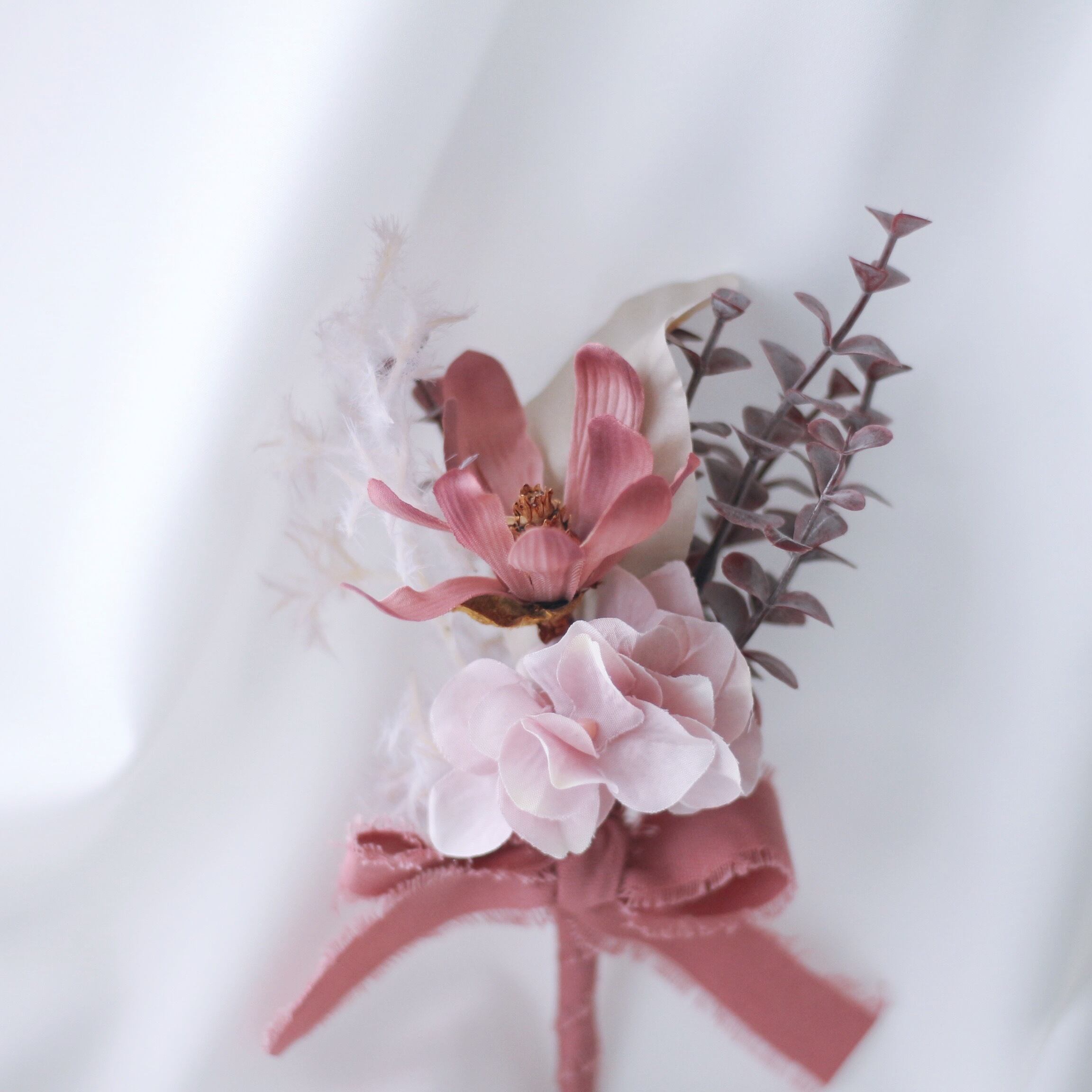 クラシカルな雰囲気を持つマグノリアの花と、柔らかなスモークツリーが華やかさと優雅さを演出します。