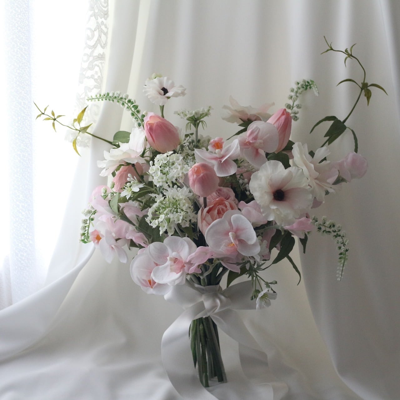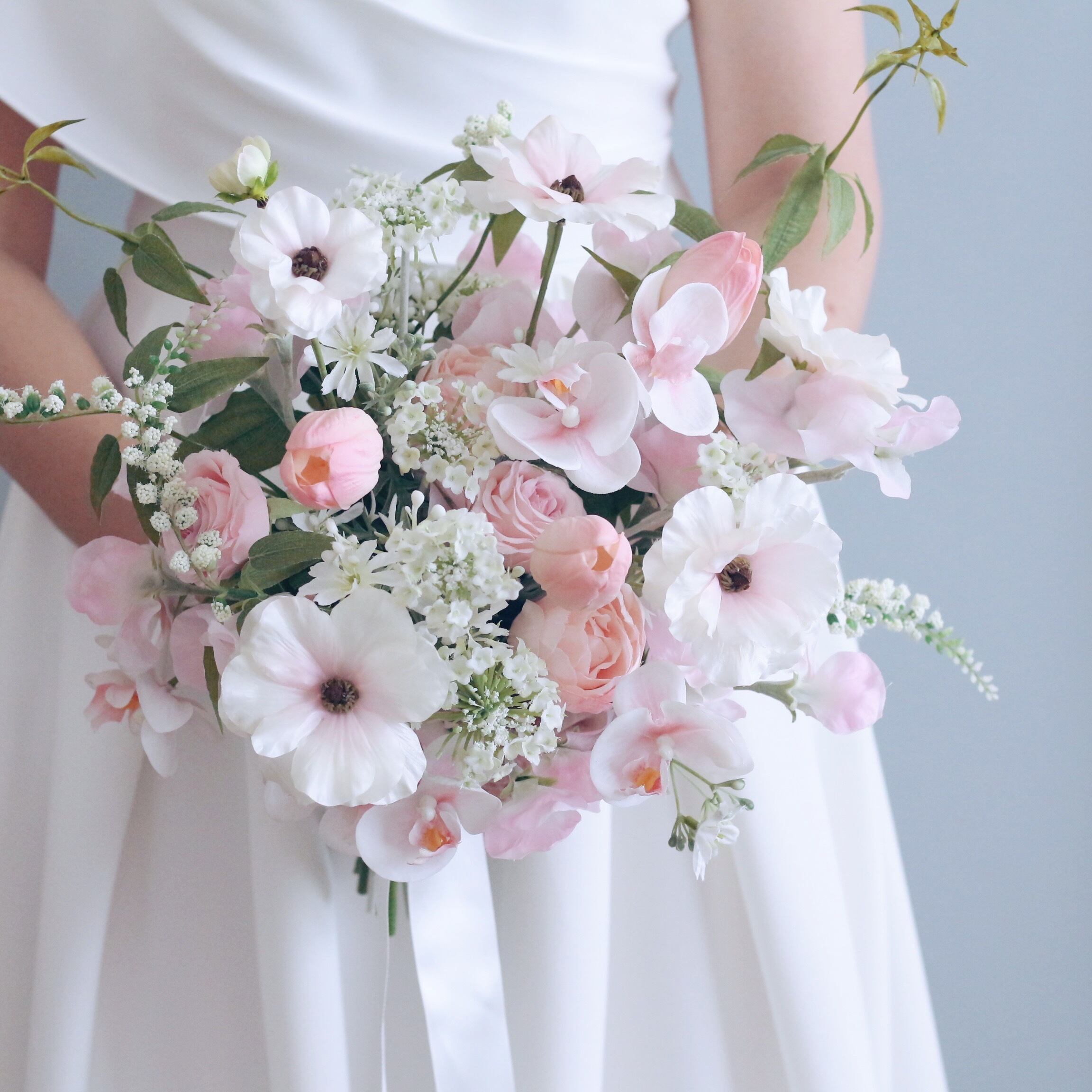 可憐な胡蝶蘭や、ローズ、チューリップ、ラナンキュラスなどの花々が、フレッシュなグリーンとバランスよく組み合わされ、結婚式や特別な日を彩ります。