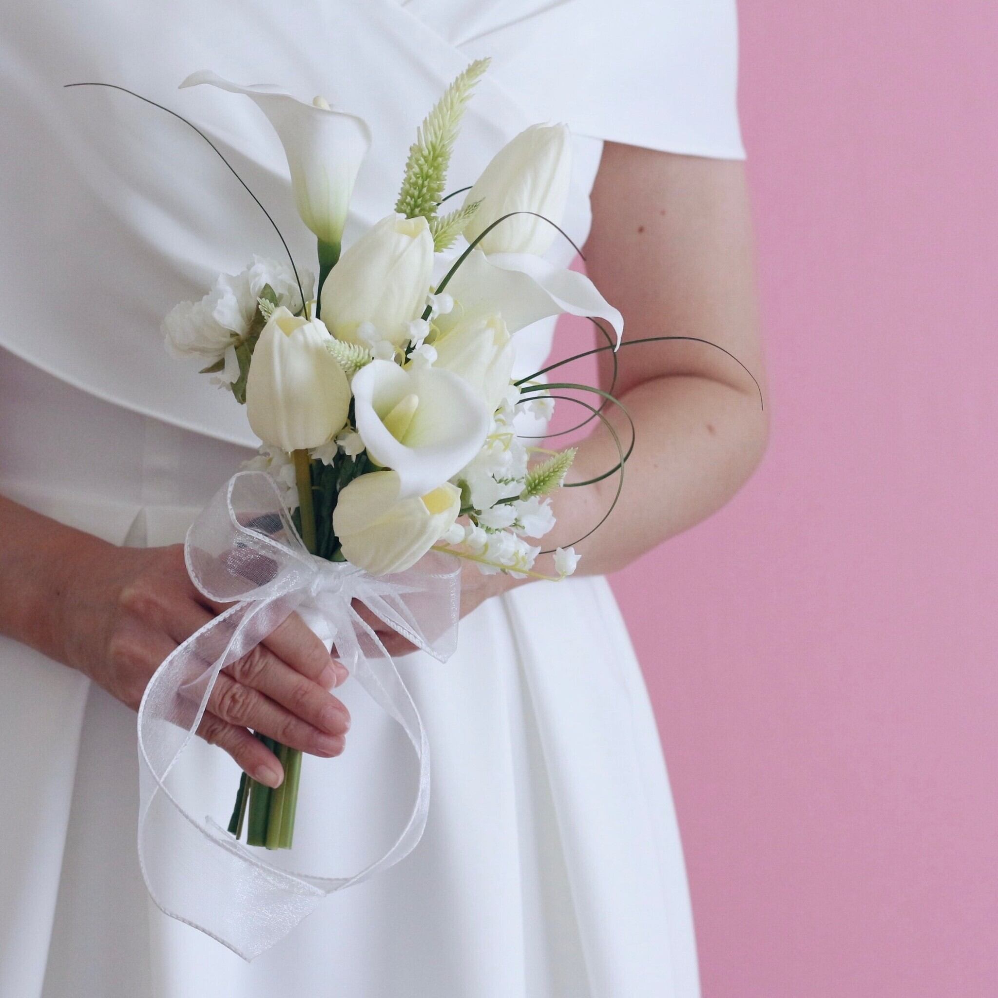 ホワイトのチューリップをメインに、カラー、スズランを組み合わせて、清潔感と華やかさを表現しました。